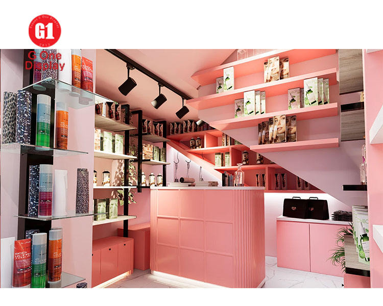 Custom Painted Island Counter Beauty Store Wall Shelf Makeup Display Stand Cosmetics Beauty Store Layout Design