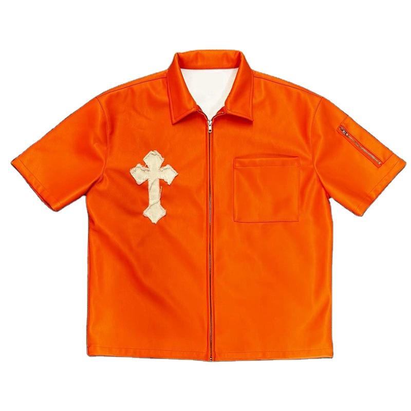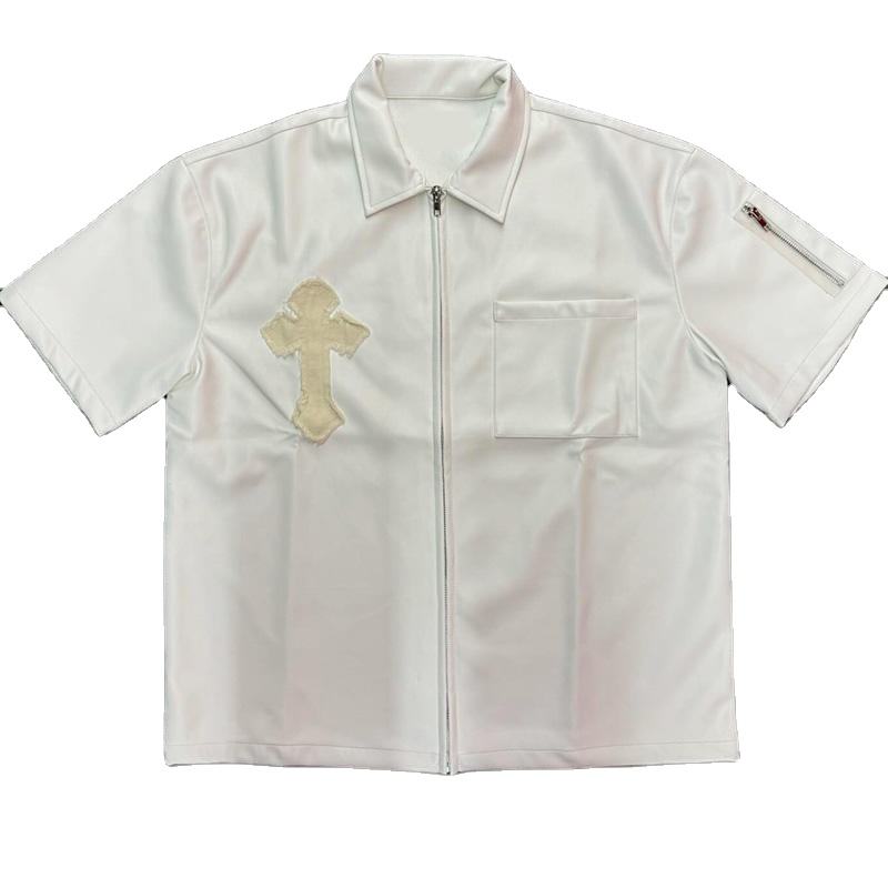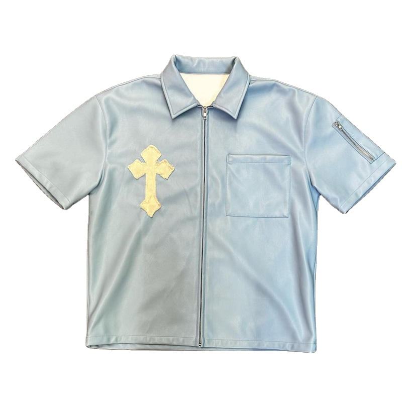 Custom Patch Embroidery T-shirt Men Zip up Leather Short Sleeve Shirt Streetwear up Leather Boxy Fit Blank Tee Shirts