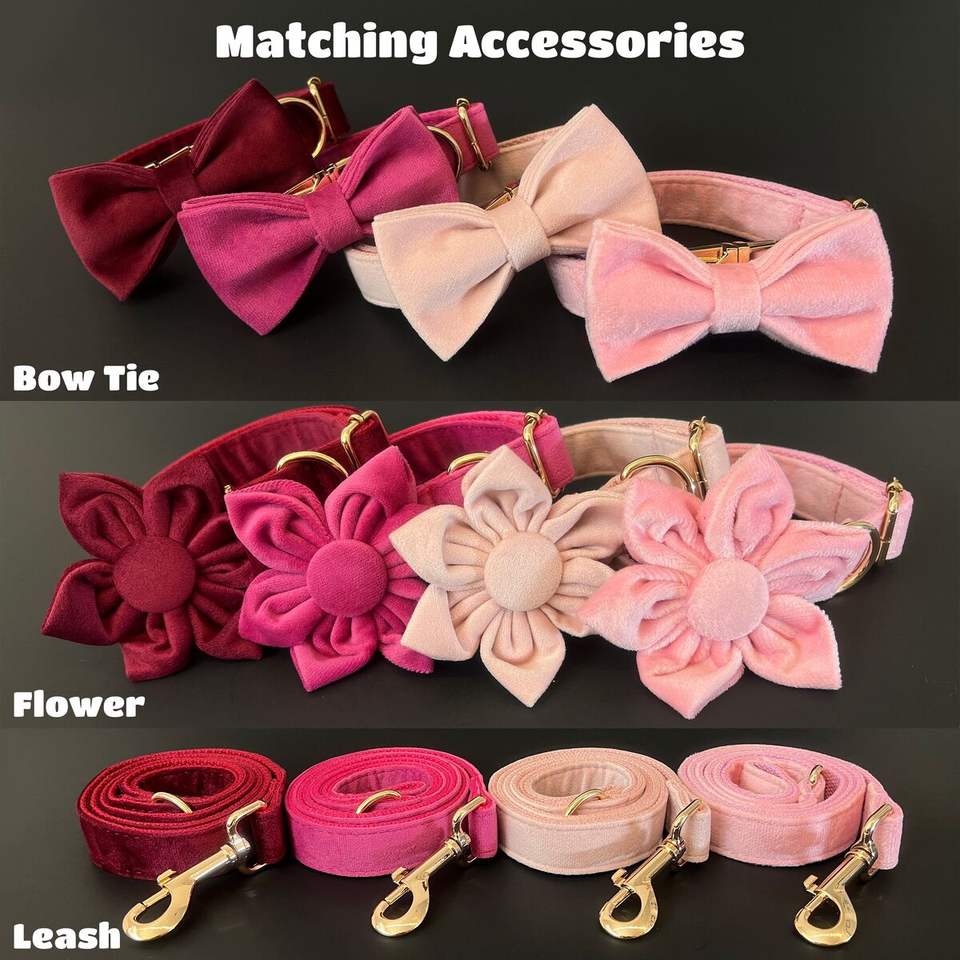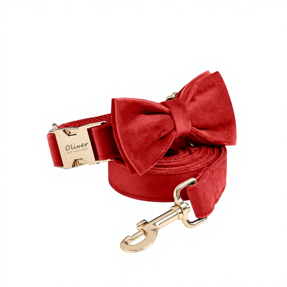Custom Personalized Engraved Red Dog Collar with Leash Set and Bowtie