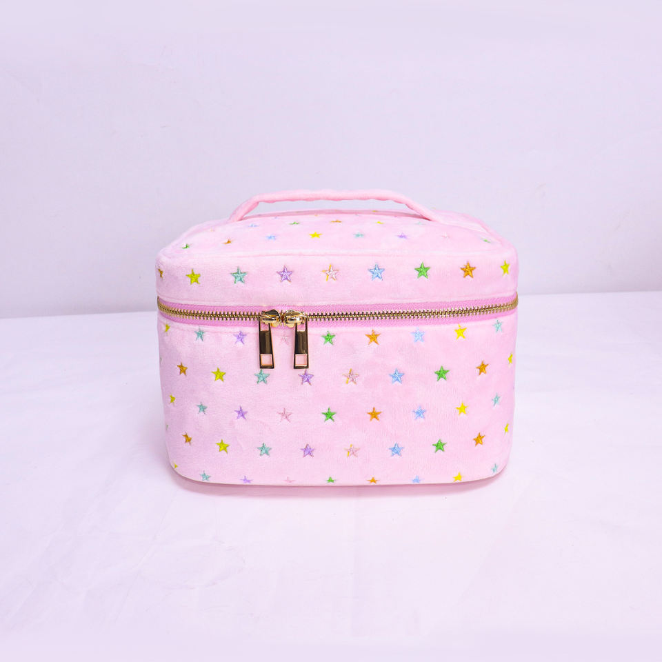 Custom Pink Terry Makeup Bag Sprinkle Embroidery Star Cosmetic Toiletry Zipper Case for Women