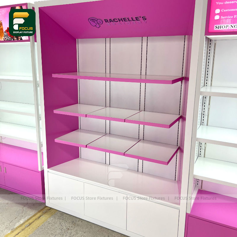 Custom Pink Wall Display Cabinet Slatwall Fixture Unit Wig Shop Storage Showcase Hair Product Retail Shelving Stand