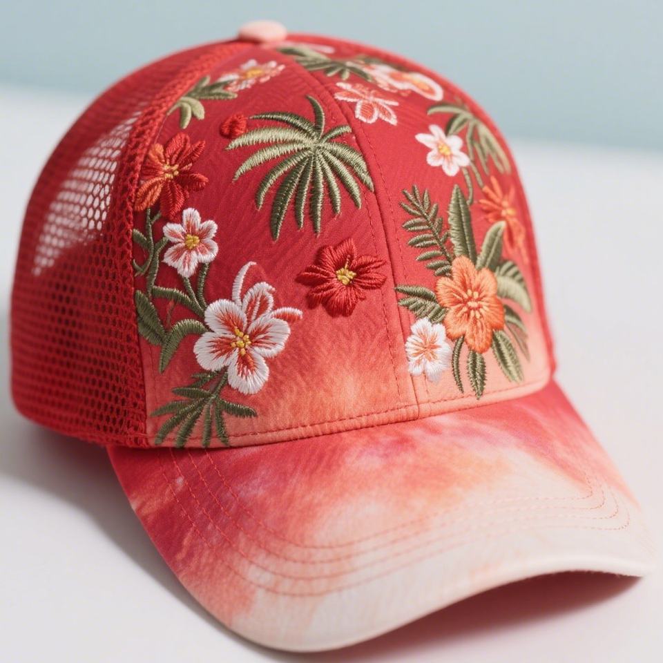 Custom Polyester Mini Ottoman Fabric 3D Embroidery Sports Cap Tree and Flower Embroidery Cap