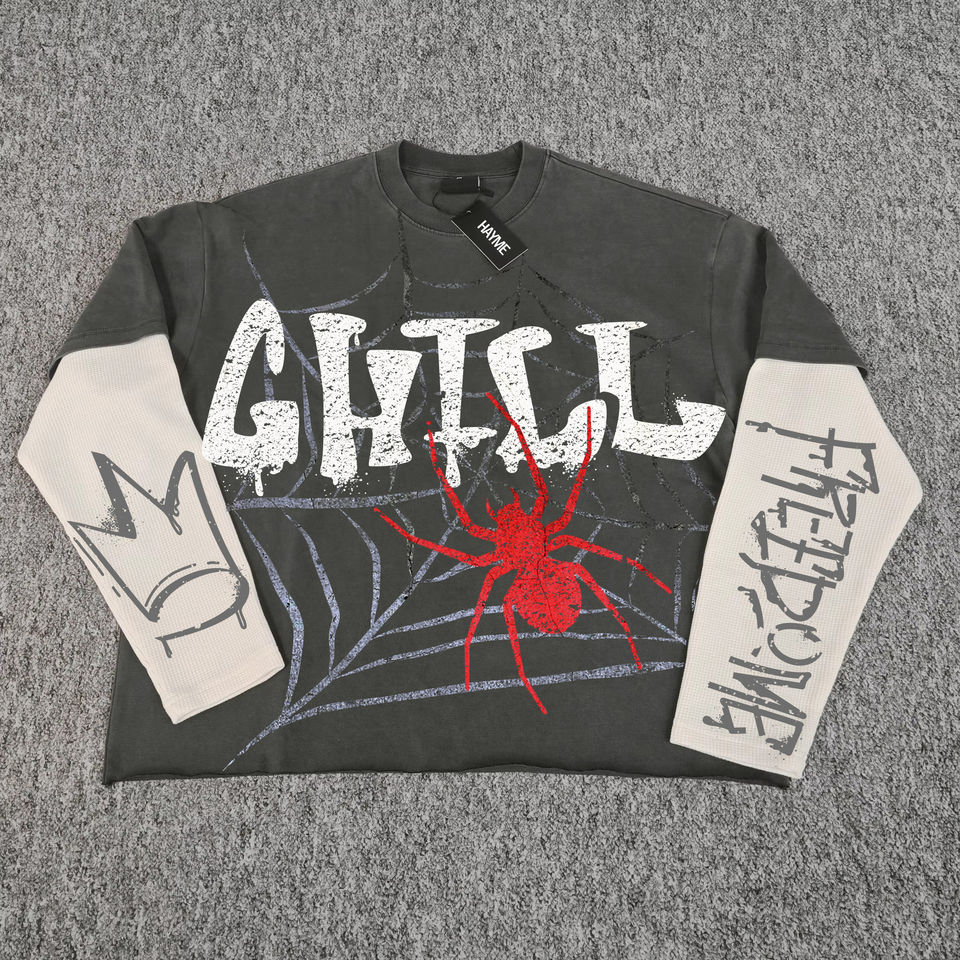 Custom Print T-Shirt Vintage Cotton Ripped Double Layer Long Waffle Sleeve Top Distressed Stone Acid Wash T Shirt