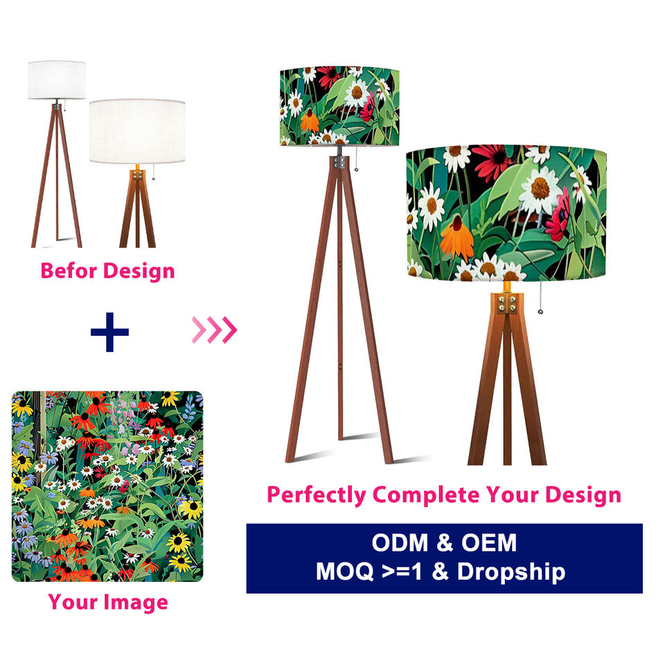 Custom Print on Demand Wood Tripod Floor Lamp Banana Leaf Pattern Linen Lampshade Dimmable Mid Century Lamp MOQ 1