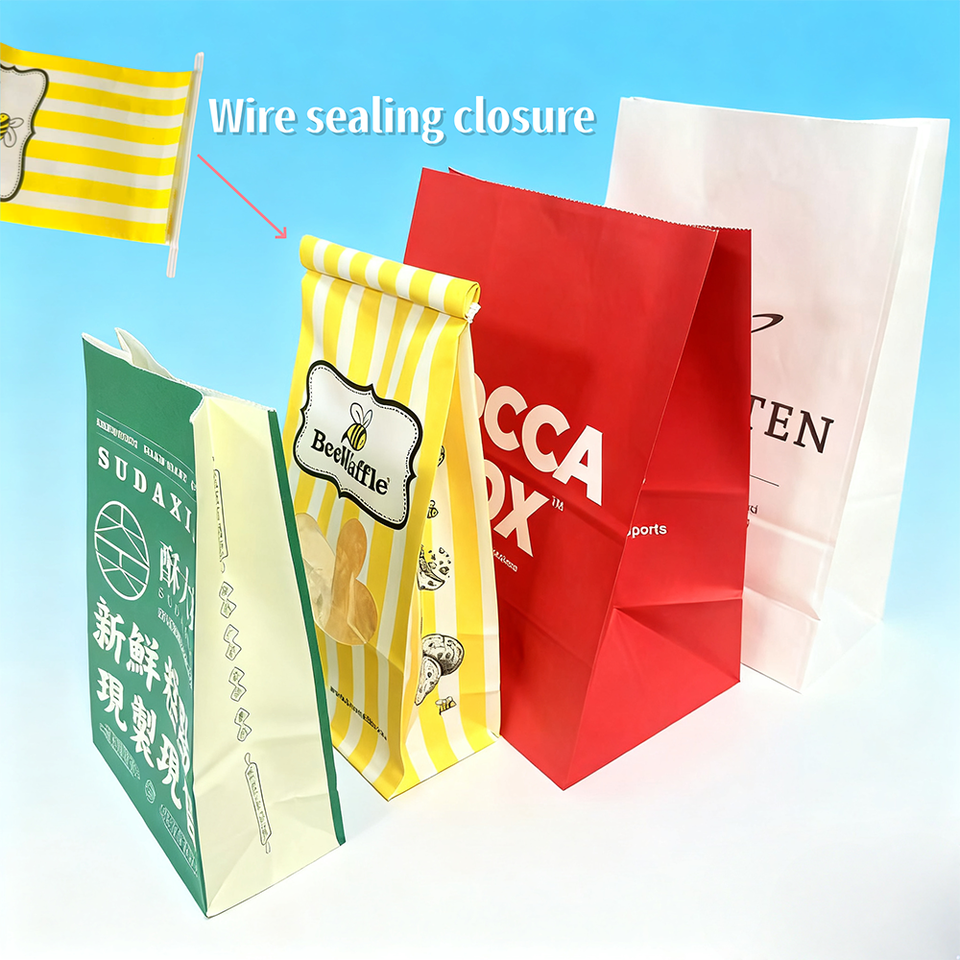 Custom Printed Food Grade Eco Friendly White Kraft Popcorn Packaging Potato Chips Paper Bag with Tin Tie