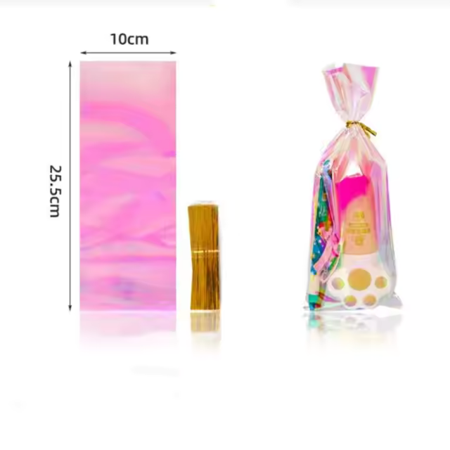 Custom Printed Holographic Rainbow BOPP Clear Cellophane Treat Bags for Birthday Halloween Easter-Plastic Food Snacks Ties