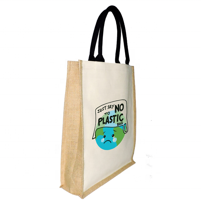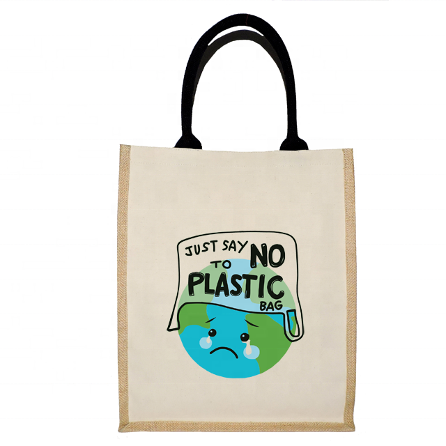 Custom Printed Jute Canvas Laminated Foldable Grocery Shopping Bag Handbag with Cotton Handle Cartoon Pattern for Gift
