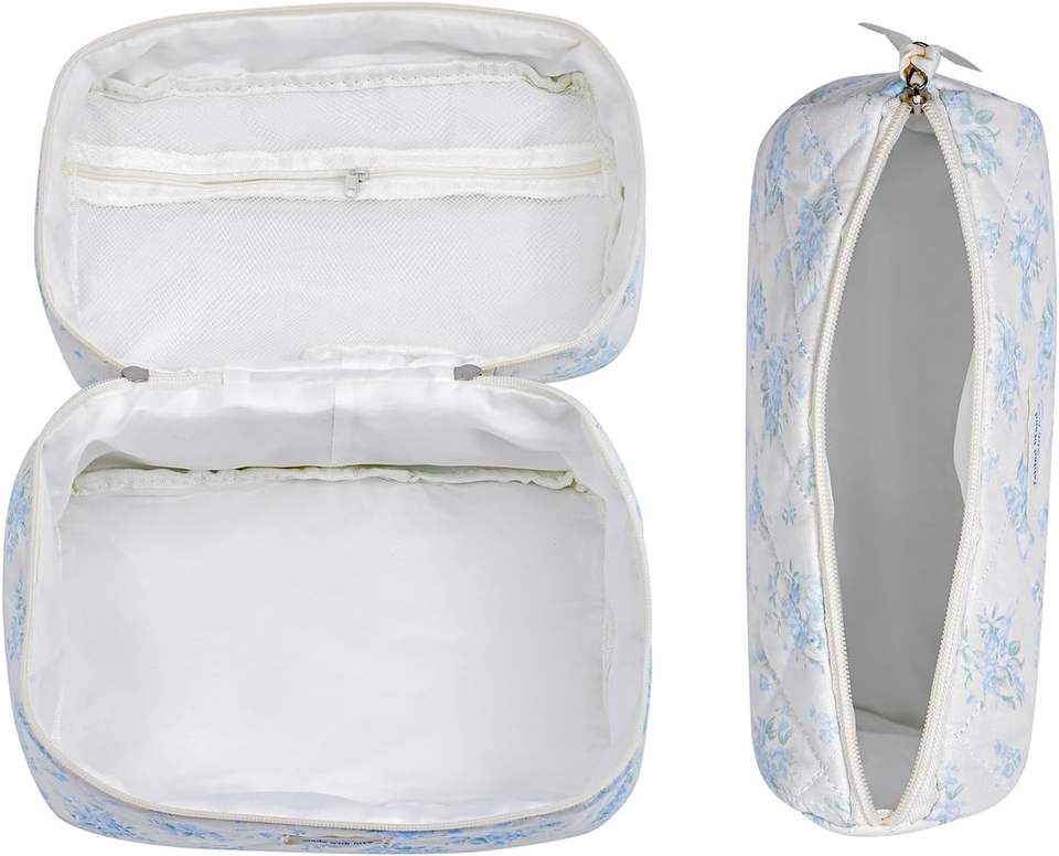 Custom Printed Lady Style Quilted Makeup Pouch Large Cotton for Toiletry Bag with 3-Set Floral Zipper Cosmetic Organizer Case