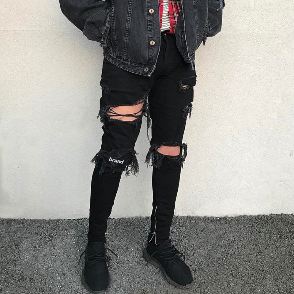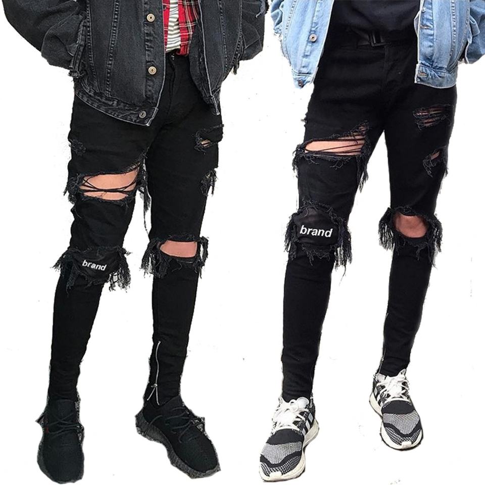 Custom Printed Logo Knee Patched Denim Jeans Manufacturers Men Skinny Stretch Destroyed Jeans Pants