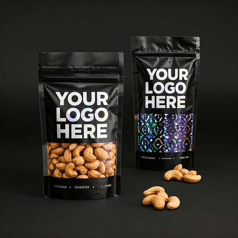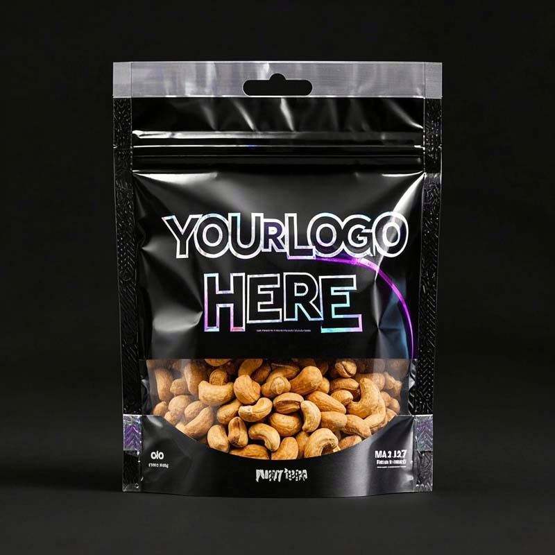 Custom Printed Matte Black Mylar Bags for Food Retail Gravure Printing Foil Packaging Window for Cashew Nuts Chewing Gum Sushi