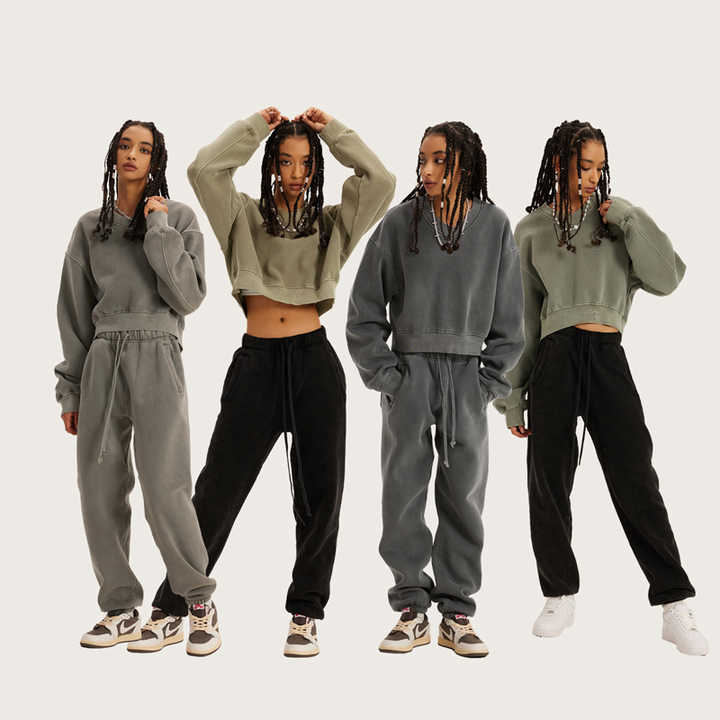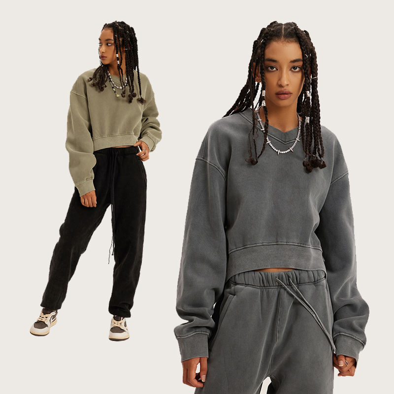 Custom Printed Women's Oversized 400 Gsm Heavyweight Vintage Washed Crop Top Hoodies Fleece V-neck Cropped Sweatshirt Women