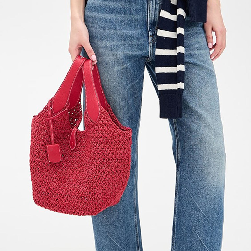 Custom Red Crochet Tote Bag with Leather Trim Eco-Friendly Ladies Handbag for Summer Autumn Travel Portable Beach Shopper Bag