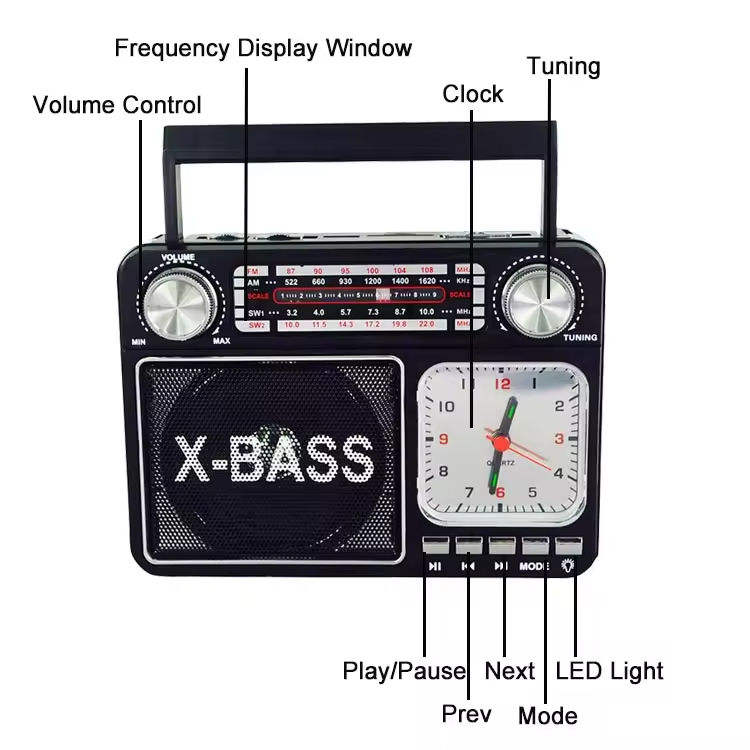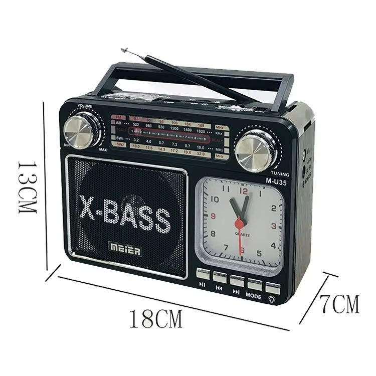 Custom Retro Portable Radio Multi Band AM FM SW Receiver X BASS USB MP3 Player With Flashlight Quartz Clock