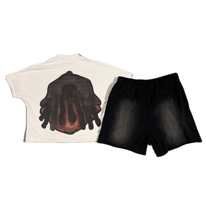 Custom Rhinestone Screen Print Two Piece Cotton Acid Wash Sun Faded T Shirt Distressed Side Stripe Sweat Shorts Sets for Men