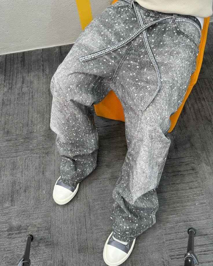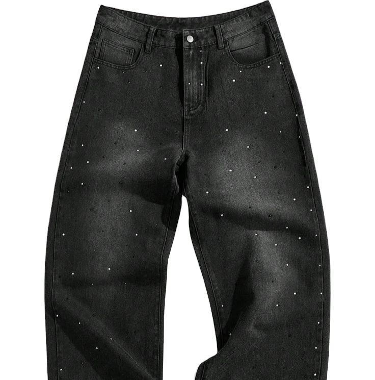 Custom Rhinestone Split Hem High Waisted Skinny Fit Jeans for Men