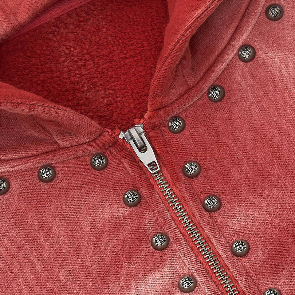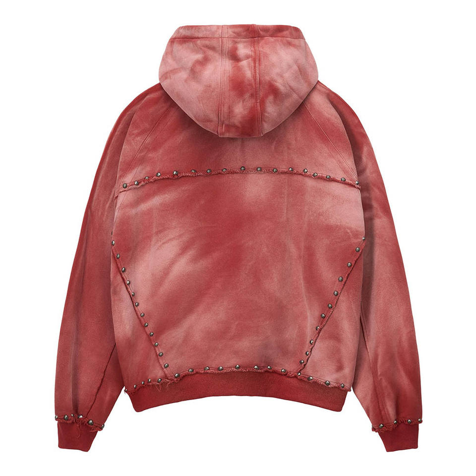 Custom Rivet Rhinestone Hoodie Fleece Jacket French Terry Cotton Vintage Distressed Gradient Acid Wash Zip up Hoodie