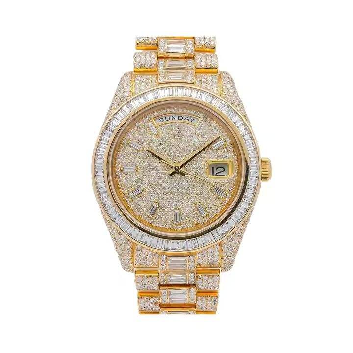 Custom Round & Baguette Cut Yellow Gold Diamond Watch / Gold Iced Out Handcrafted Party Wear Luxurious Watch