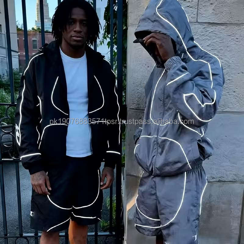 Custom Shell Track Jogging Suit Waterproof Polyester Oversized Zip up Hoodie Jacket and Short Set Reflective Nylon Tracksuit Men