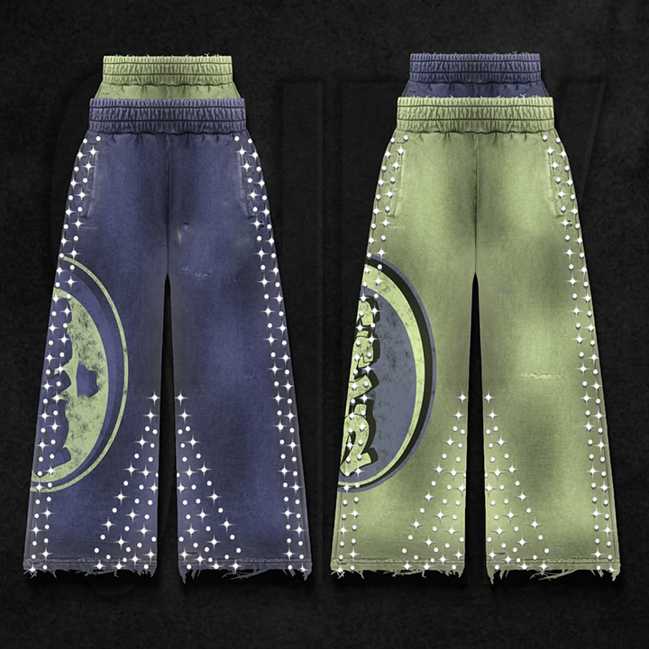 Custom Side Rhinestone Trousers Elastic Waist Acid Washed Double Waist Baggy Wid Leg Stacked Street Style Sweatpants for Men