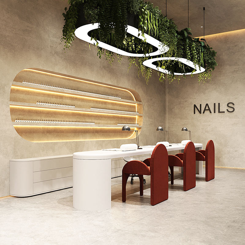 Custom Simple Style Nail Bar Salon Furniture Wooden Nail Display Cabinet Modern Beauty Styling Spa Nail Salon Interior Design
