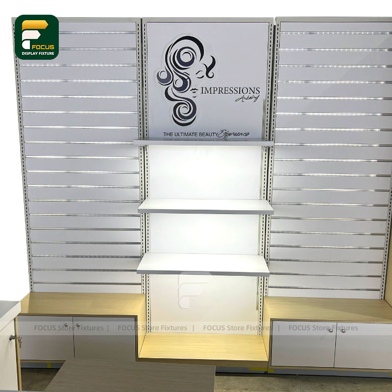 Custom Slatwall Display Cabinet Wig Store Wall Mounted Panel Rack Retail Shop Display Furniture Fixture Unit