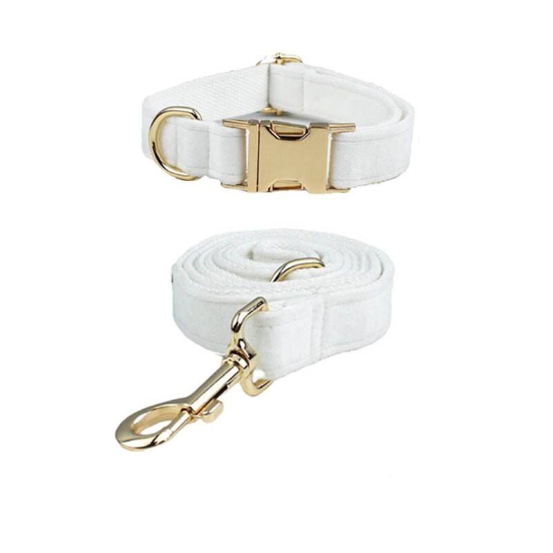 Custom Solid White Velvet Nylon Personalized Collar Matching Bowtie Flower Leash H-Style Harness Dog Poop Bag Combo