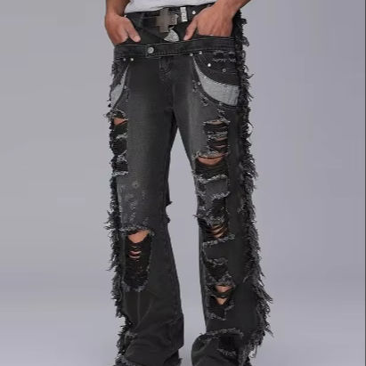 Custom Street Retro American Fashion Heavy Industry Double Waist Broken Beard Denim Pants Men Loose Casual Pants