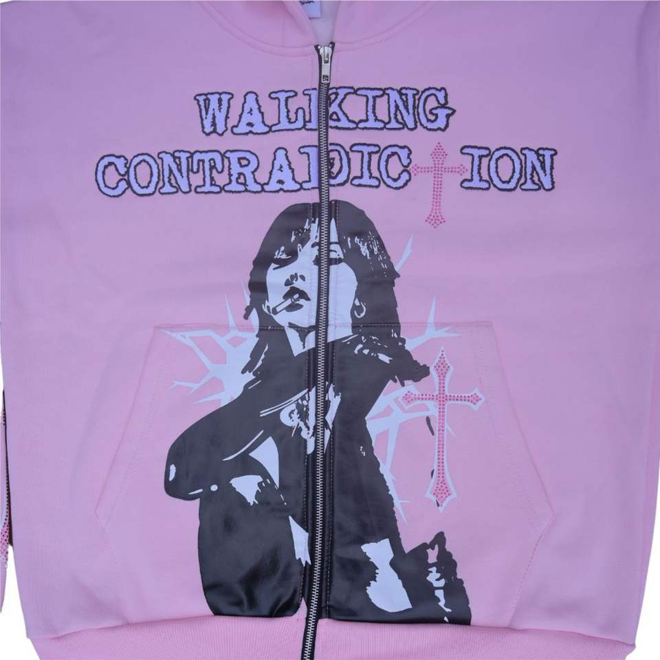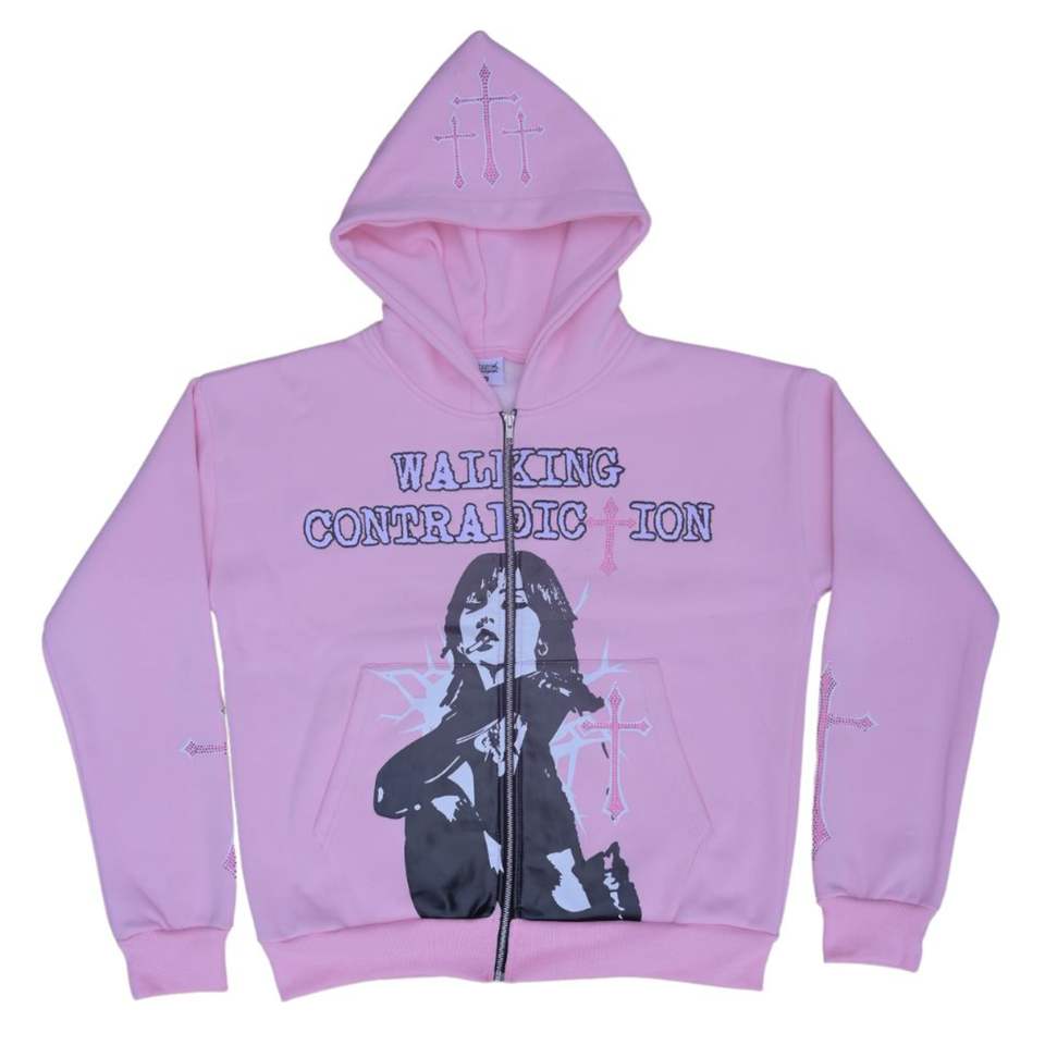 Custom Streetwear Heavy Weight Pink Rhinestone Hoodie with Embroidery & Printing Custom Logo Unisex Oversize Mens Zip-Up Hoodie