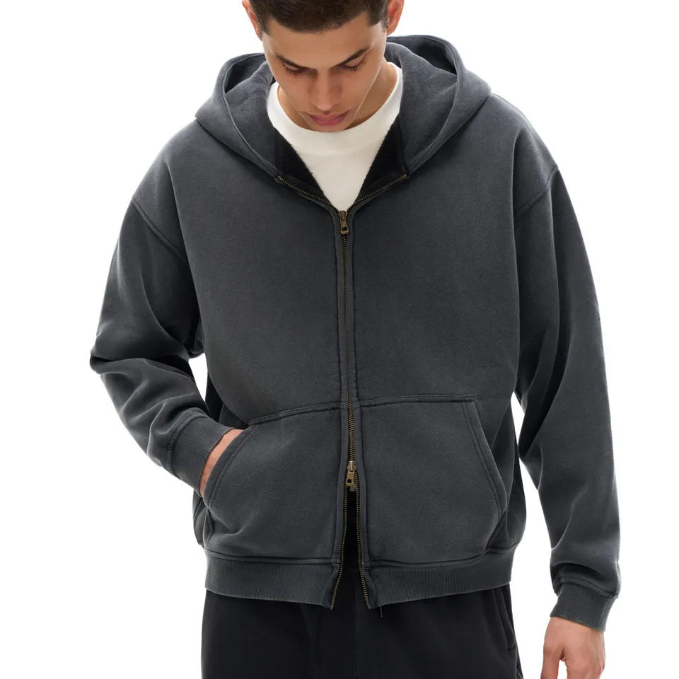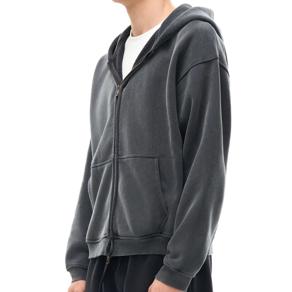 Custom Streetwear Men's Zip up Hoodie Washed Black Vintage Heavyweight Acid Wash Distressed Zip up Hoodie Printing Logo