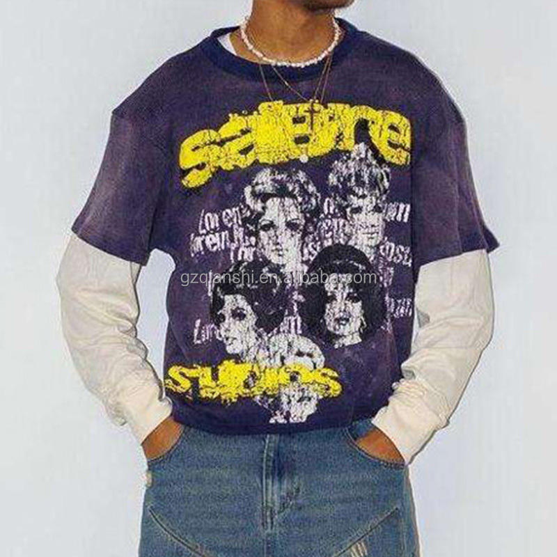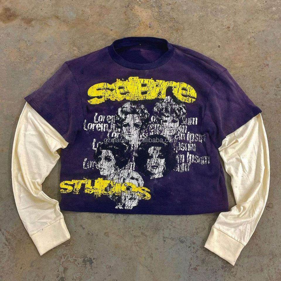 Custom Streetwear Oversized Thermal Long Sleeve T Shirts for Men Vintage Screen Print Double Layer Long Sleeve T-shirt