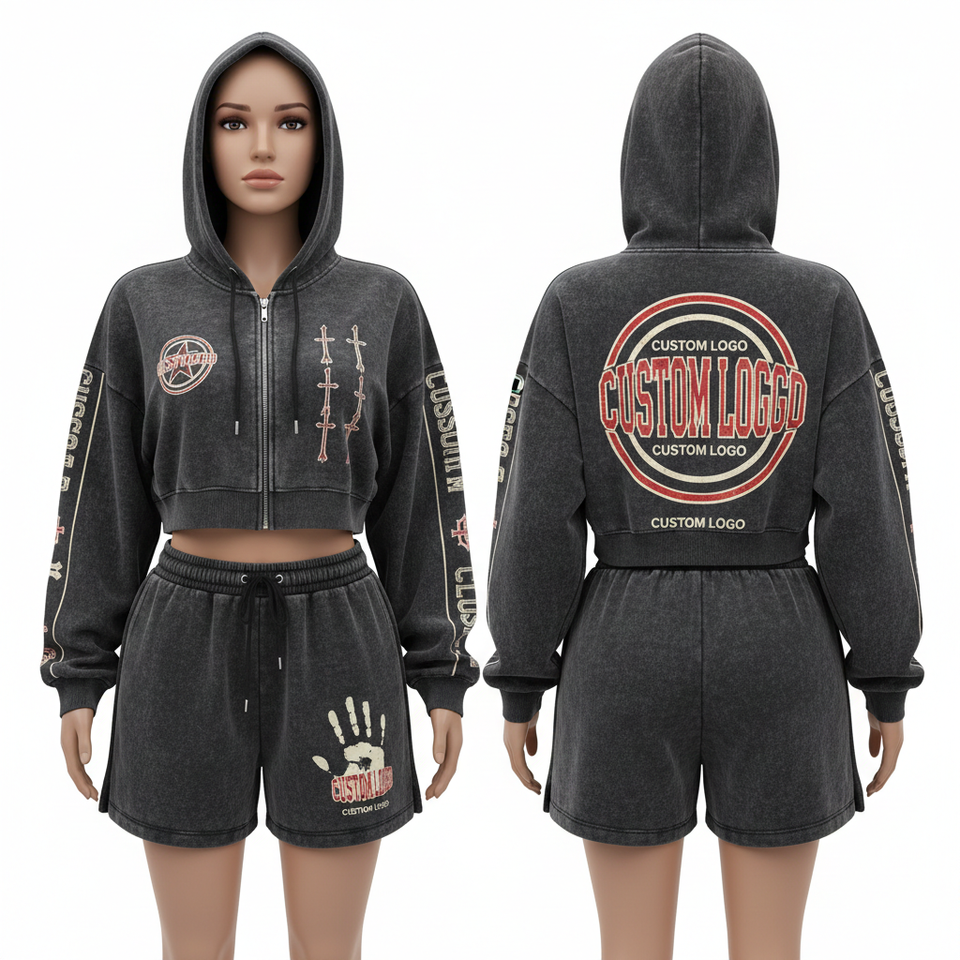 Custom Streetwear Oversized Zip Up Hoodie And Sweat Short Set For Women Embroidery 2 Piece Zipper Hoodie and Shorts Sweatsuit