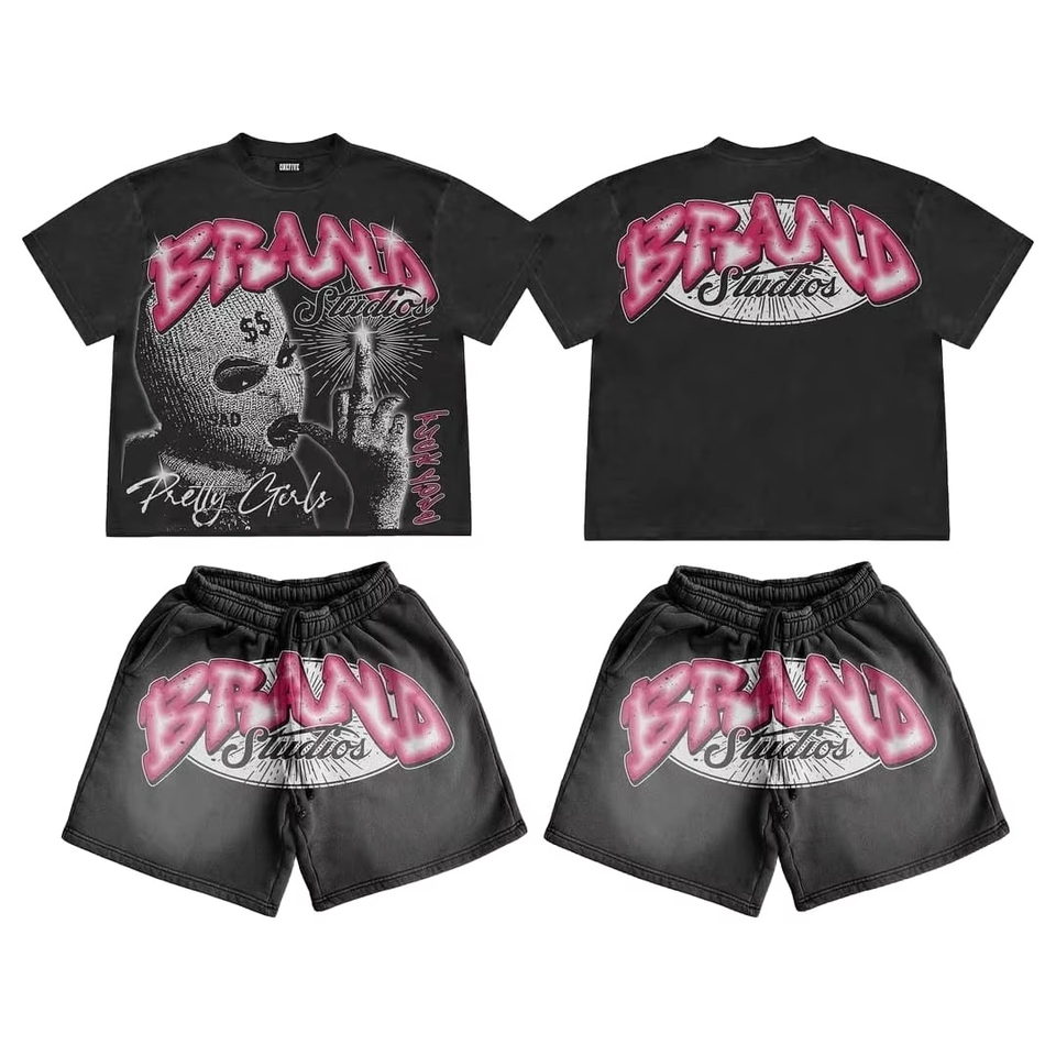 Custom Streetwear Tracksuit Cotton Acid Washed Shorts Sportswear Gym Summer Jogger 2 Piece Shorts and t Shirt Set for Men