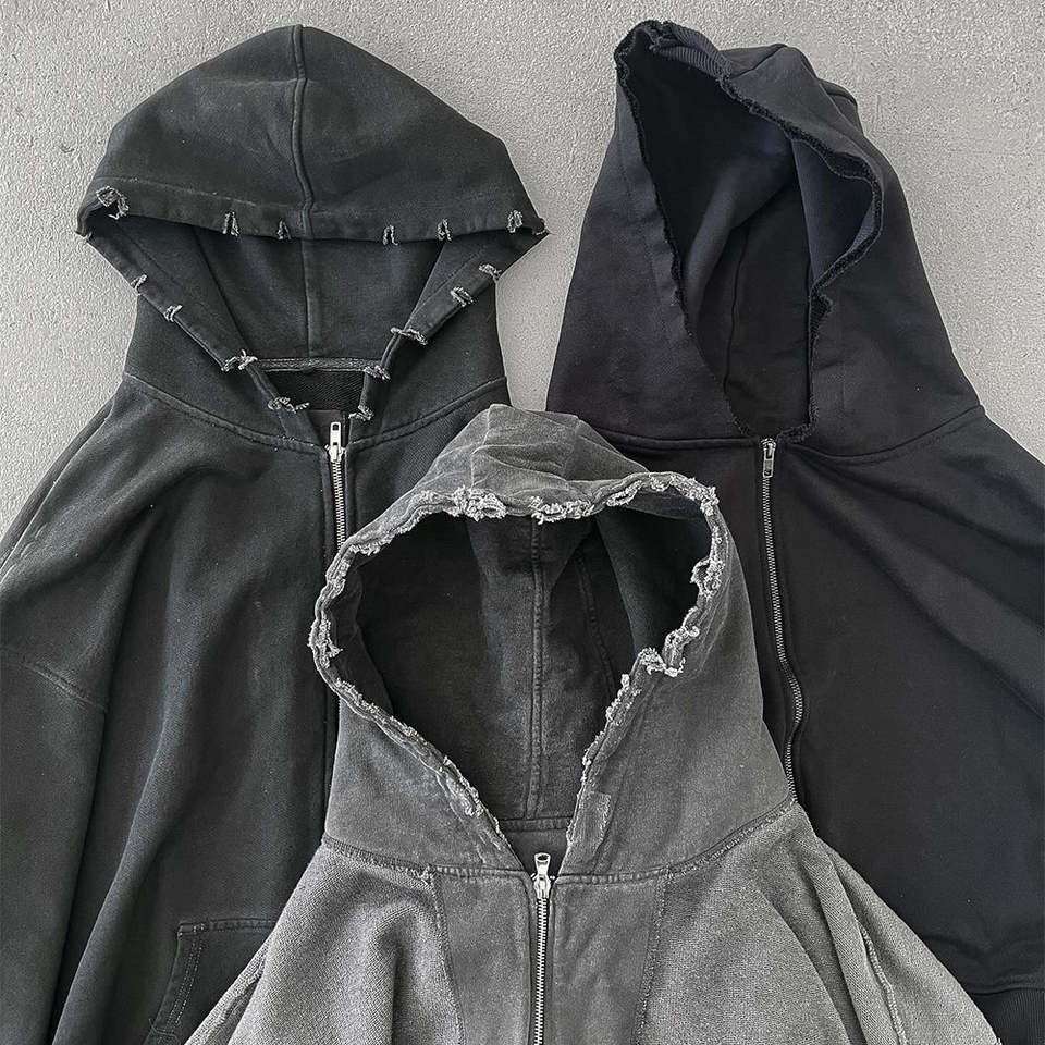 Custom Streetwear Washed Hoodies Mens Blank Black 450gsm French Terry Vintage Distressed Acid Wash Zip up Hoodie Men