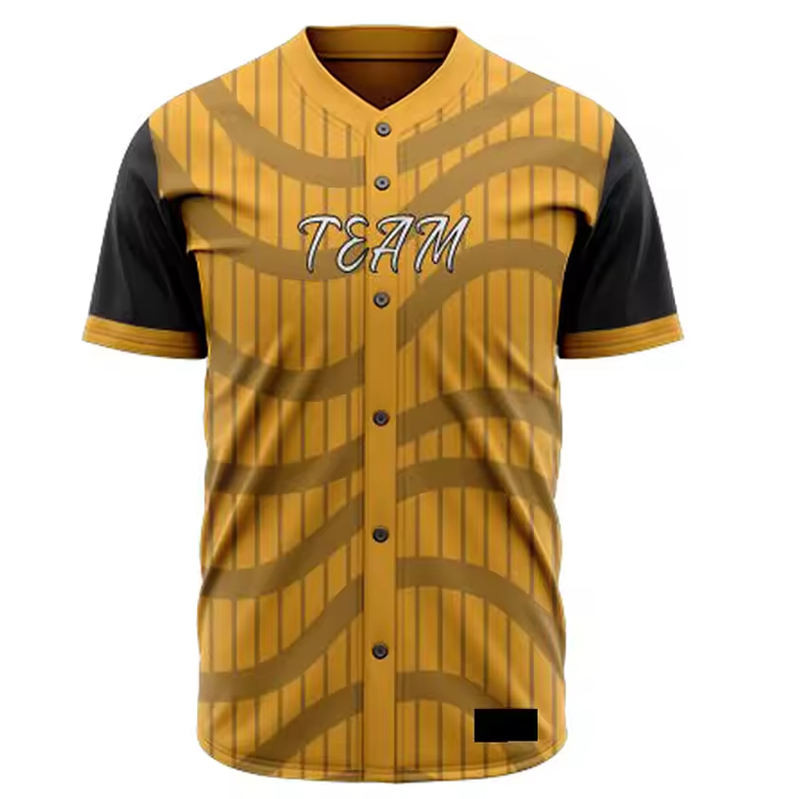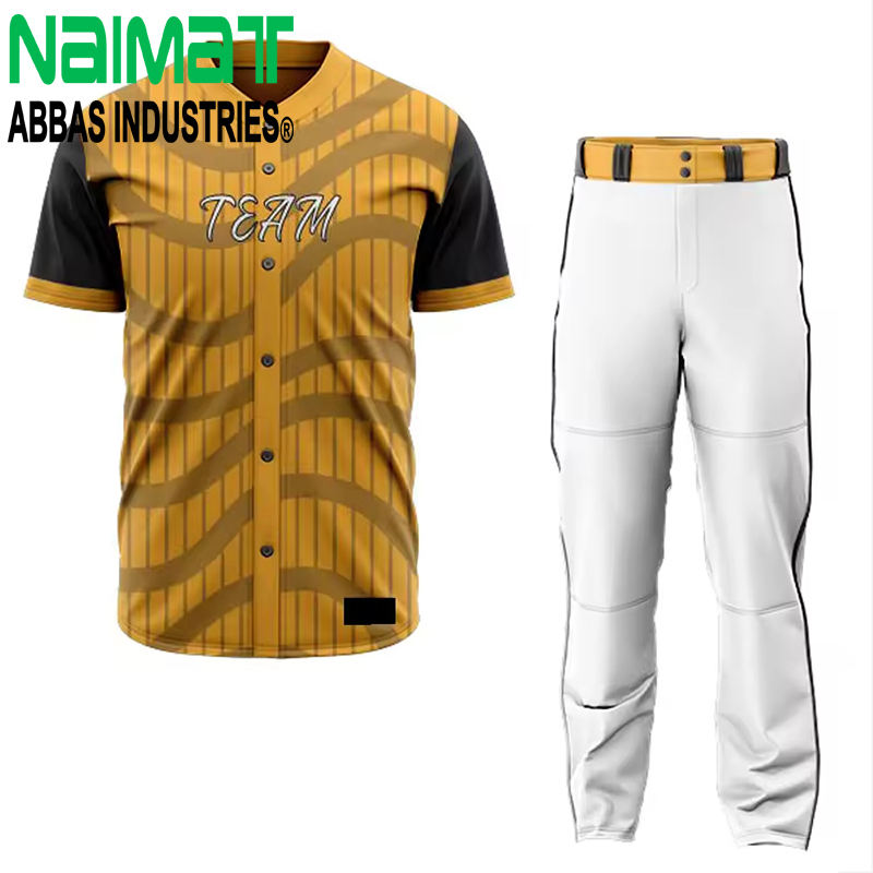 Custom Sublimation Baseball Uniform Set Yellow Pinstripe Wave Pattern Jersey with White Pants Performance Team Sportswear