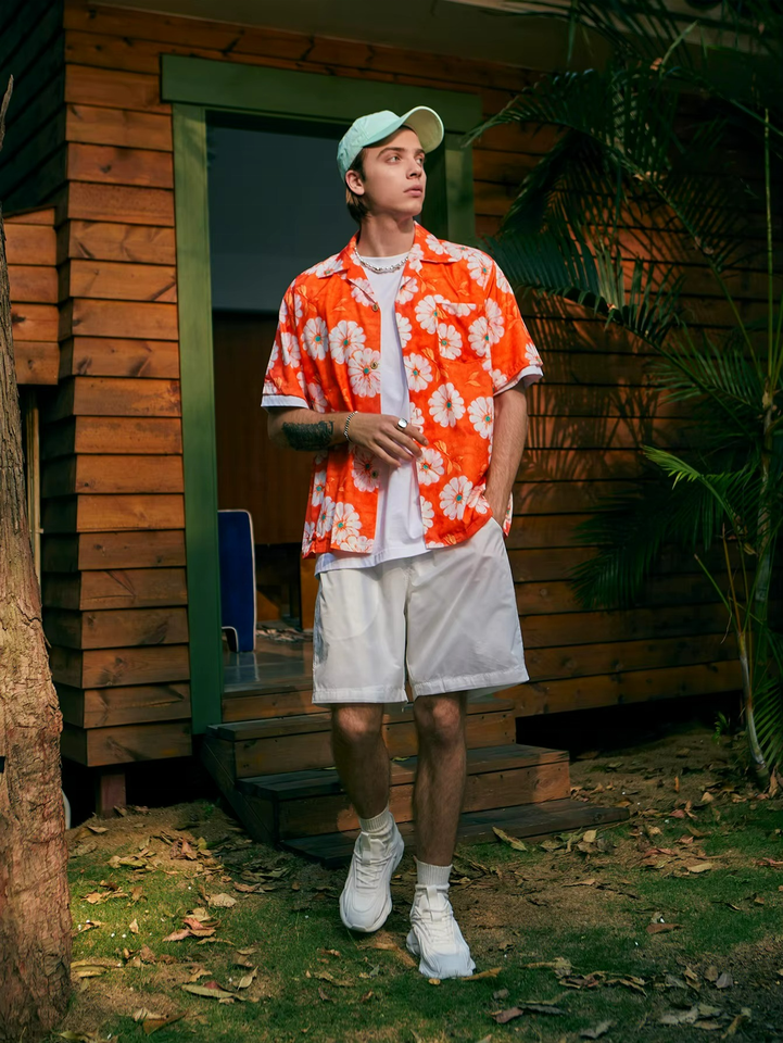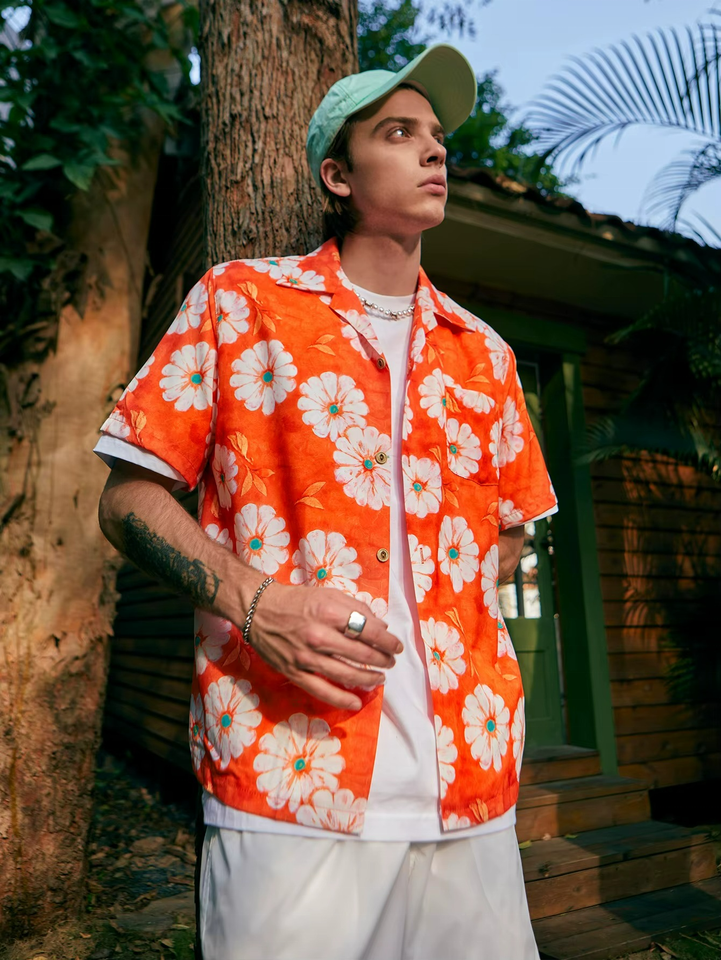 Custom Summer Hawaiian Shirt Orange Allover Printed Digital Printing Cuba Collar Short Sleeve Shirt