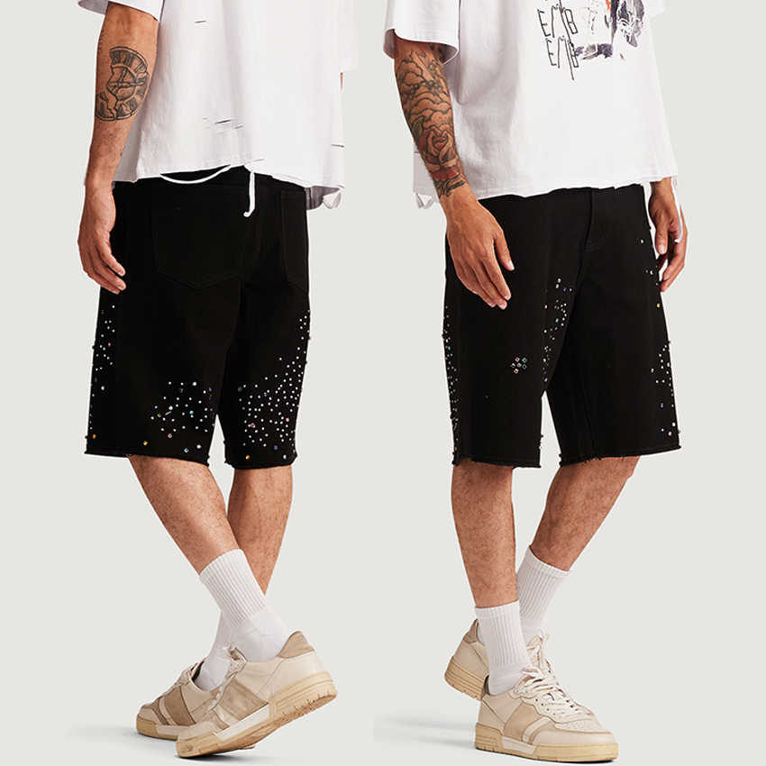 Custom Summer Men's Jean Shorts Rhinestone Jorts Men Black Added Gem Diamond Denim Shorts For Men 2025
