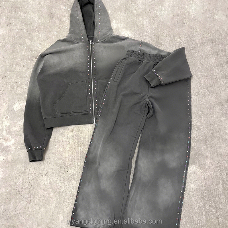 Custom Sweat Stack Pant Track Suits Acid Wash Tracksuit Rhinestone Zip up Hoodie and Flare Sweatpants Sweatsuit Set high quality