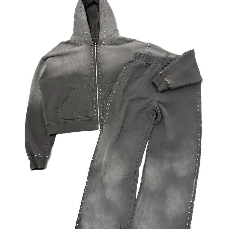 Custom Sweat Stack Pant Track Suits Acid Wash Tracksuits Rhinestone Zip up Hoodie and Flare Sweatpants Sweatsuit Set for Men