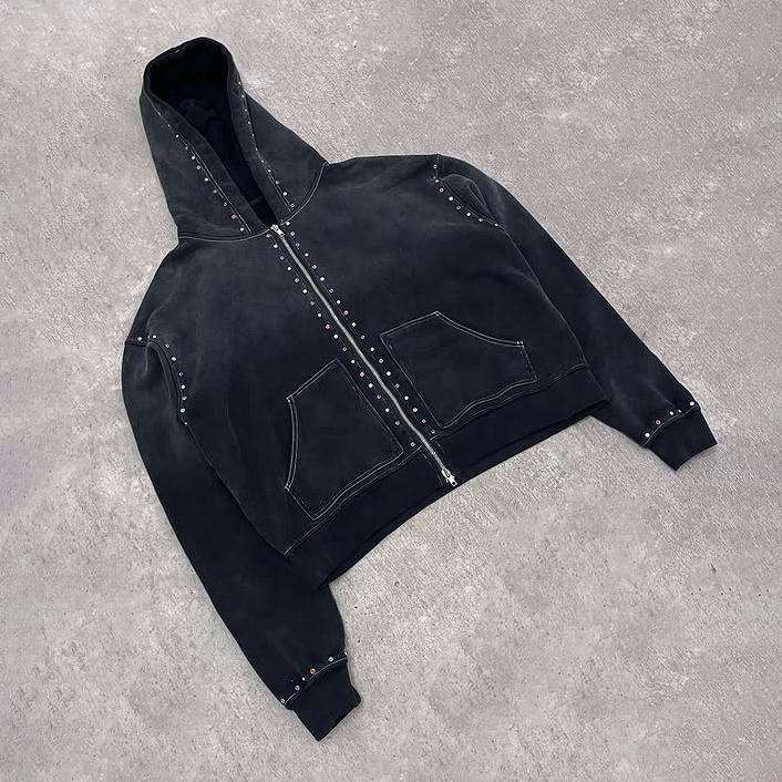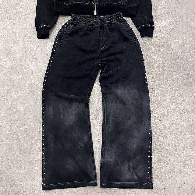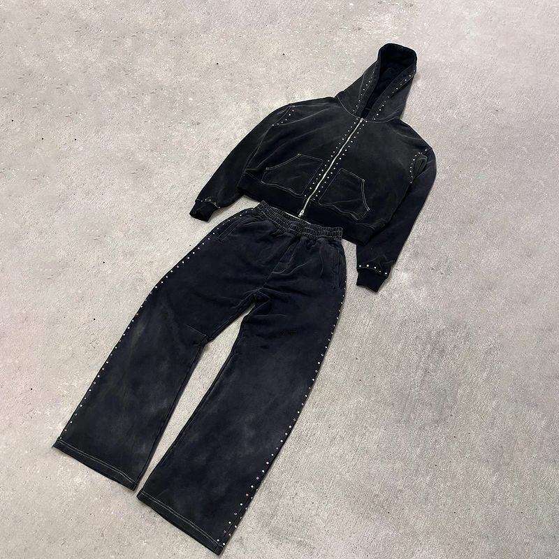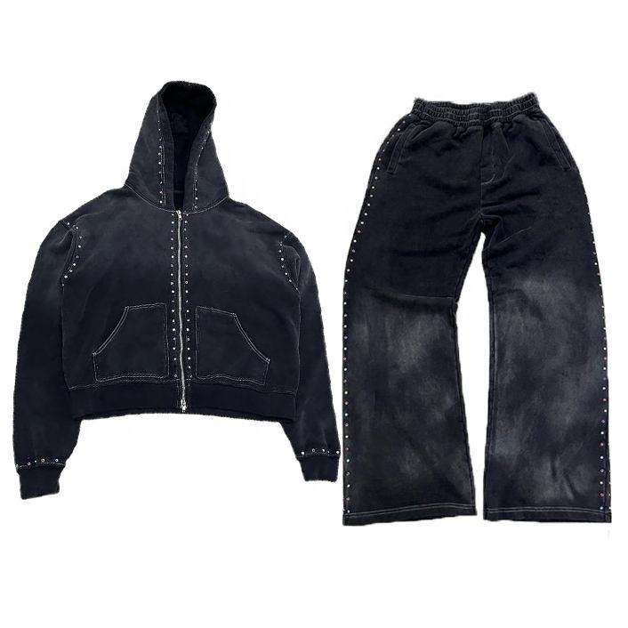 Custom Sweat Stack Pant Track Suits Wash Tracksuit Rhinestone Zip up Hoodie and Flare Sweatpants Sweatsuit Set for Men
