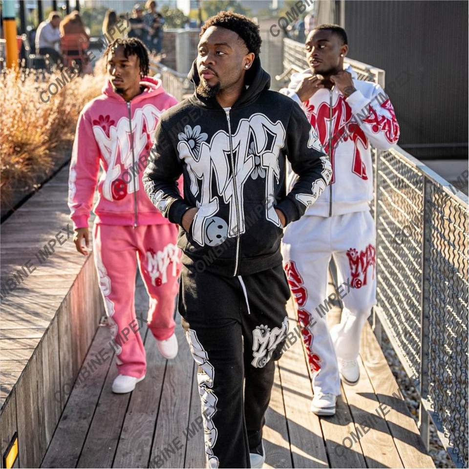 Unisex Acid Wash Two-Piece Streetwear Outfit Trendy Fit Custom Hooded Joggers Hoodie Printed Distressed Custom Fashion Apparel