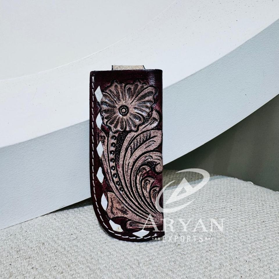 Custom Tooled Leather Slip for Folding Knife Clip Case Western Brown Floral Leather Knife Sheath Open Top Belt Trapper Sheath
