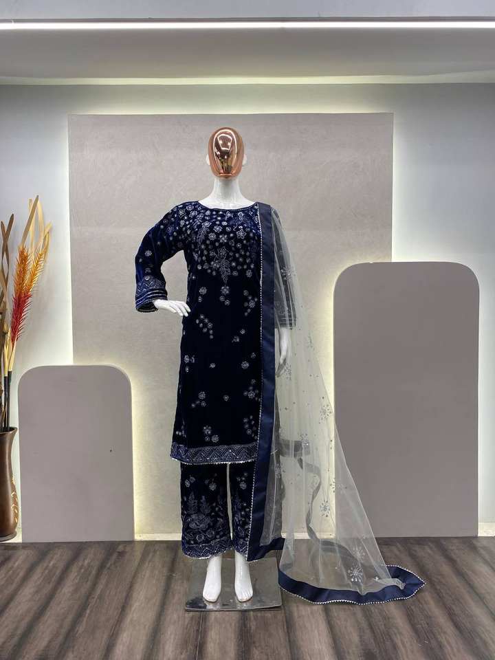 Custom Traditional Velvet Embroidered Suit Sequin Work Pant Dupatta-Ethnically Designed for Weddings Parties Festivals India