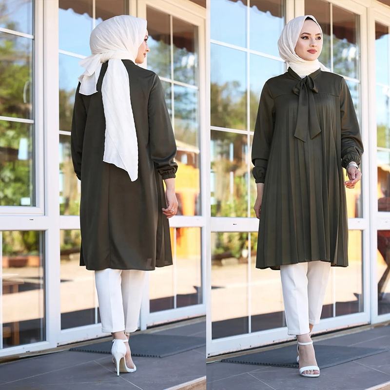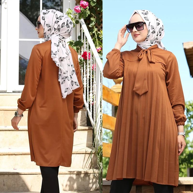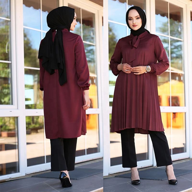 Custom Turkey Muslim Long Sleeve Pleated Chiffon Top Muslim Women Casual Crew Neck Tunic Modest Blouse