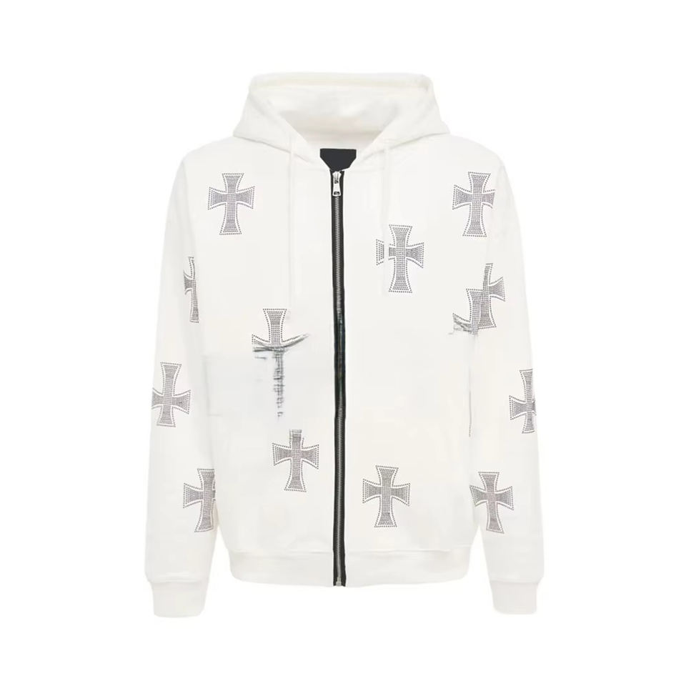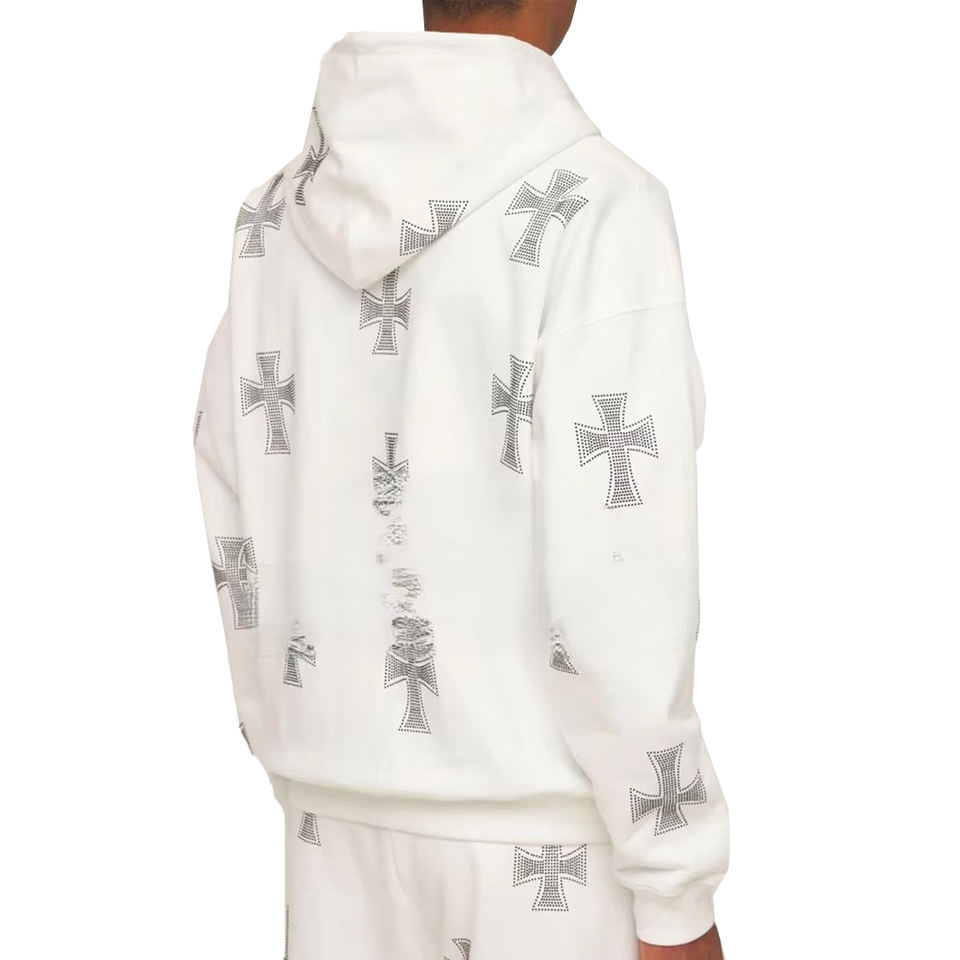 Custom Two Piece Casual Solid Rhinestones Winter Tracksuit Set Distressing Embroidery Zip Hoodie Trouser Men