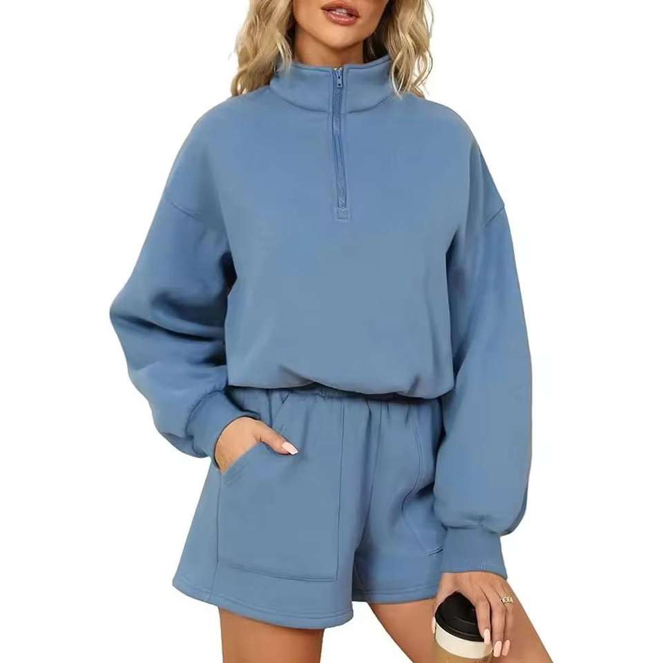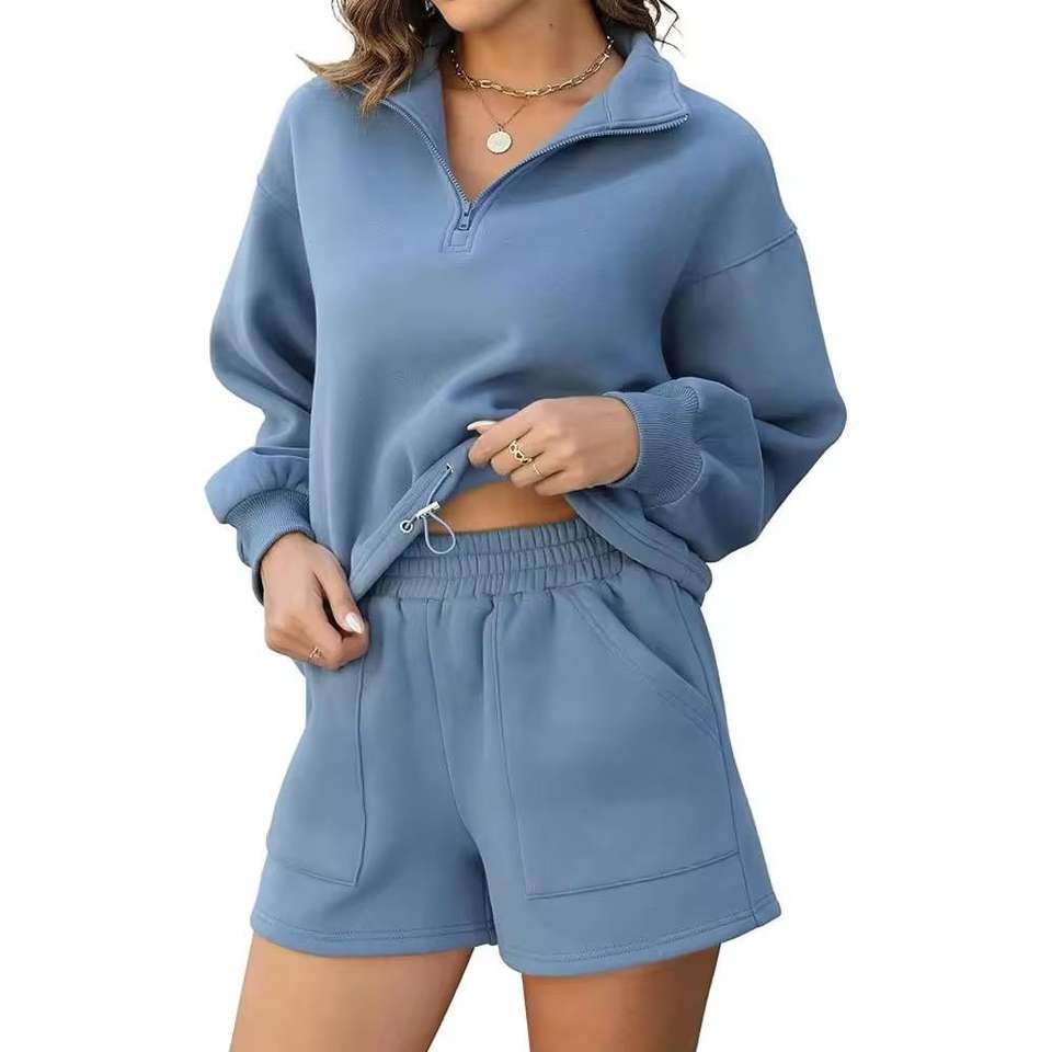 Custom Two Piece Distressed Woman Cotton Blank Zip up Cropped Sweatsuits Jogging Hoodie Tracksuits 2 Piece Shorts Set for Women