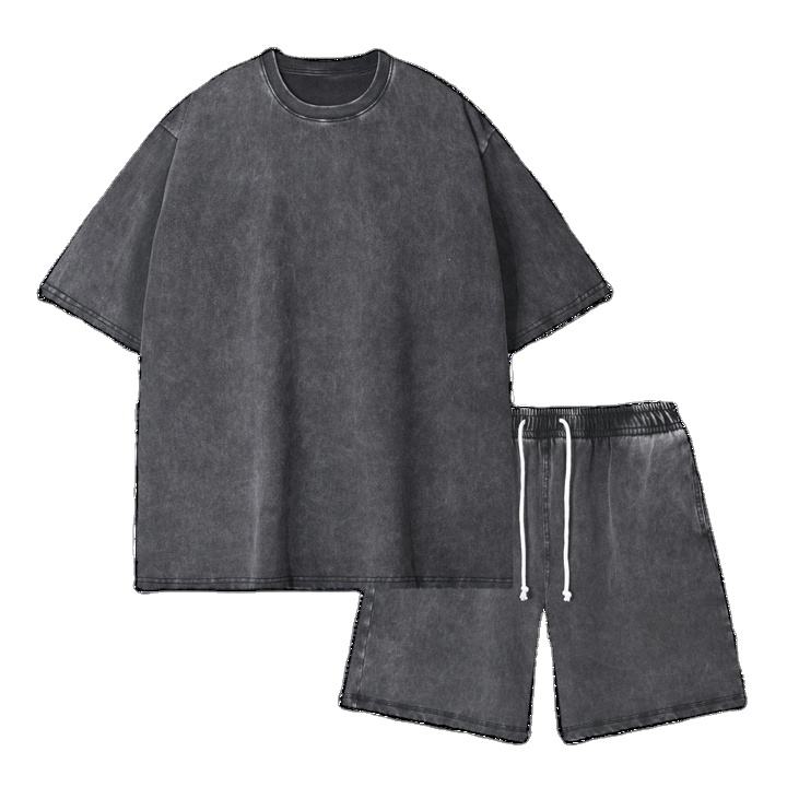 Custom Two-Piece Outfits for Men Distressed Acid Wash T-Shirt Shorts Set Heavyweight Cotton Tracksuit