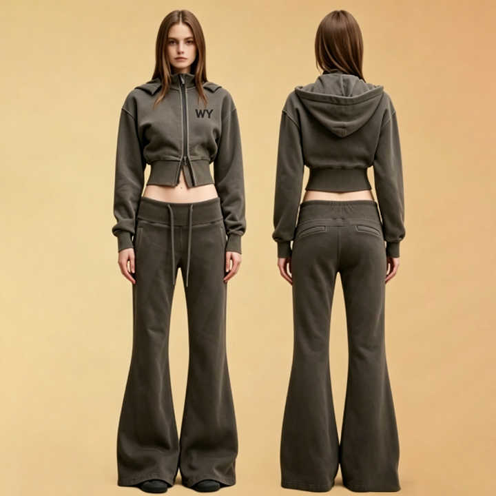 Custom Two Piece Set Cropped Zip Up Hoodie Streetwear Y2K Women and Vintage Acid Wash Tracksuit Women Flared Sweatpants Set