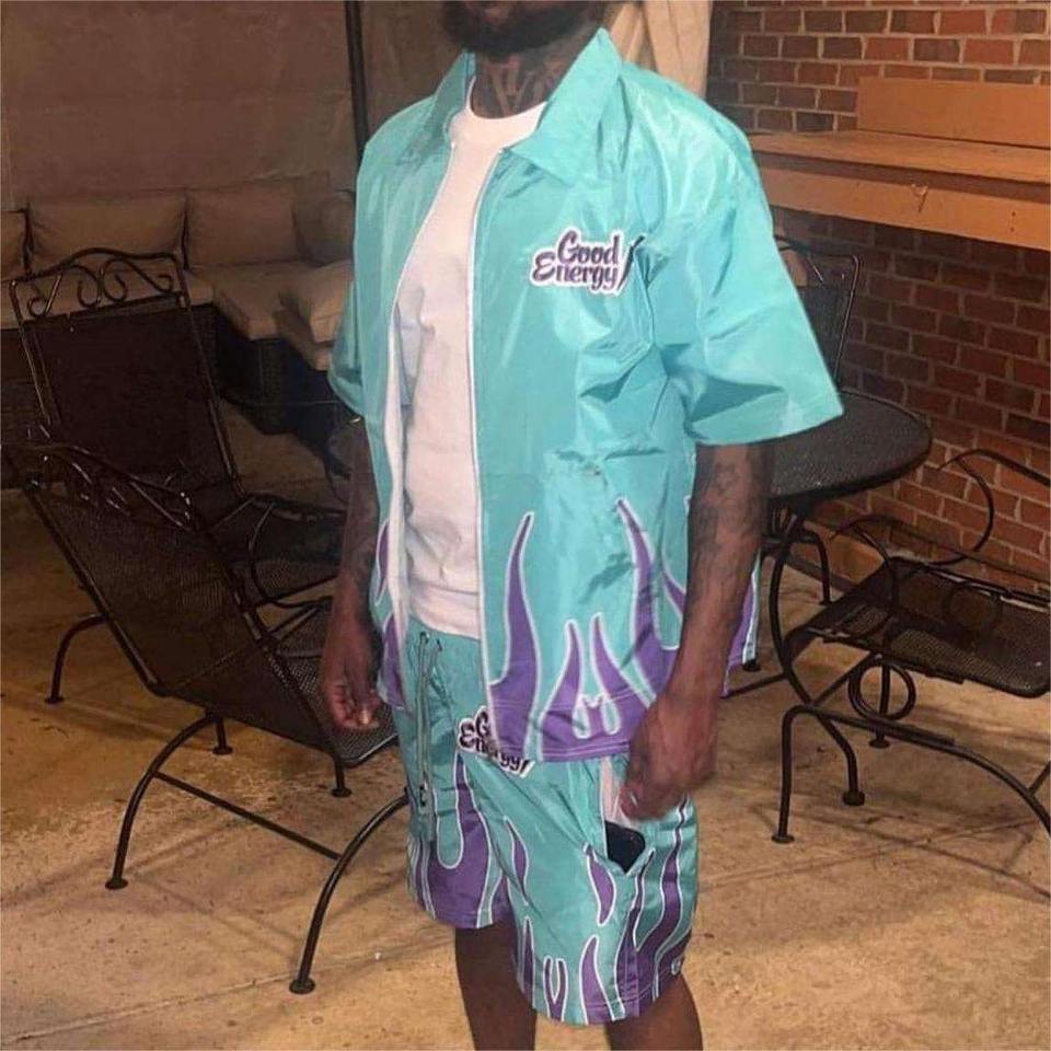 Custom Two Piece Windbreaker Flame Shorts Set Zip up Nylon Polyester Streetwear Tracksuit Men Windbreaker Short Set