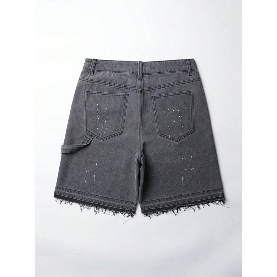 Custom Two-Tone Gray Denim Shorts for Men Streetwear Paint Splatter Raw Hem Distressed Summer Loose Fit Vintage Style Shorts