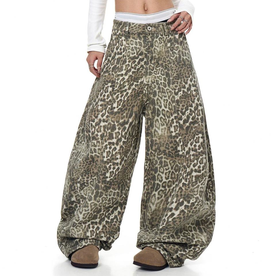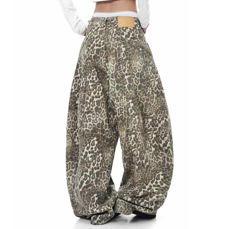 Custom Unisex Leopard Print Trend Denim Jeans Women High Street Punk Design Baggy Loose Structured Leopard Print Barrel Jeans
